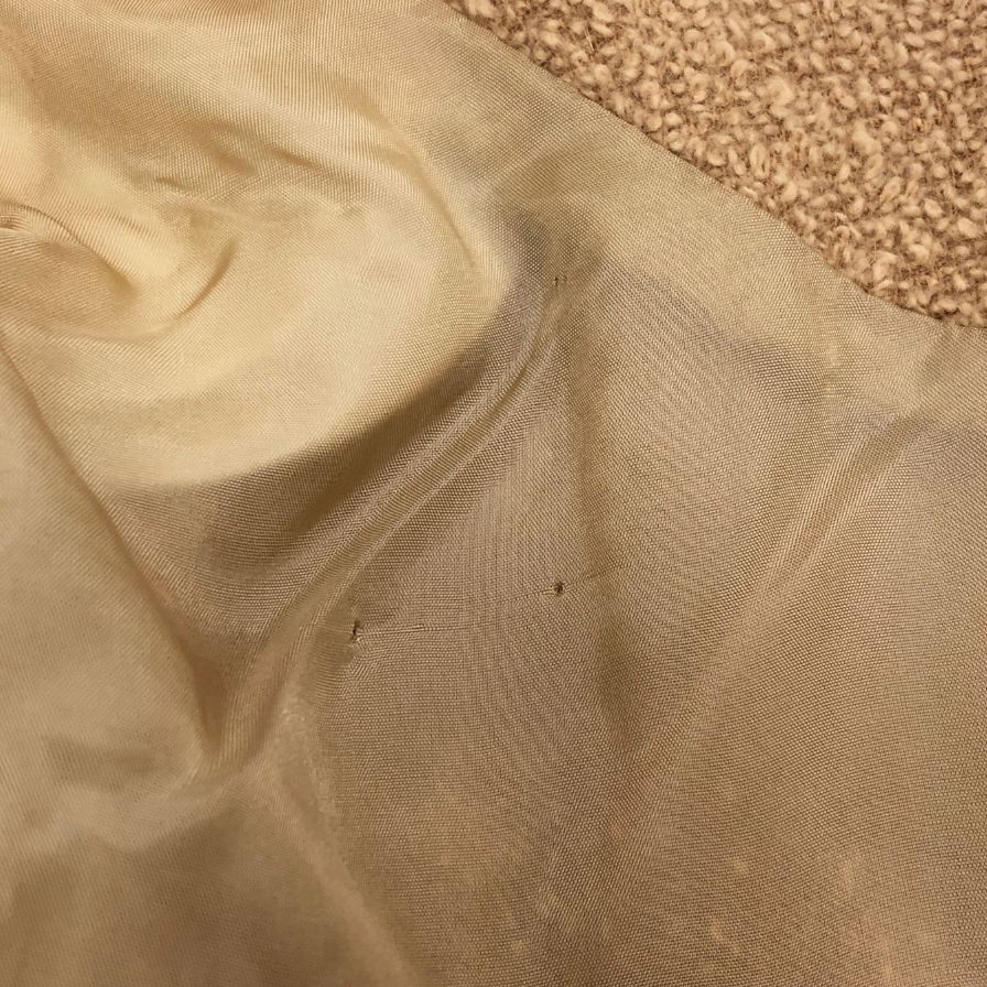 脇シミ、裏地穴、品質タグホツレが見られます。 |