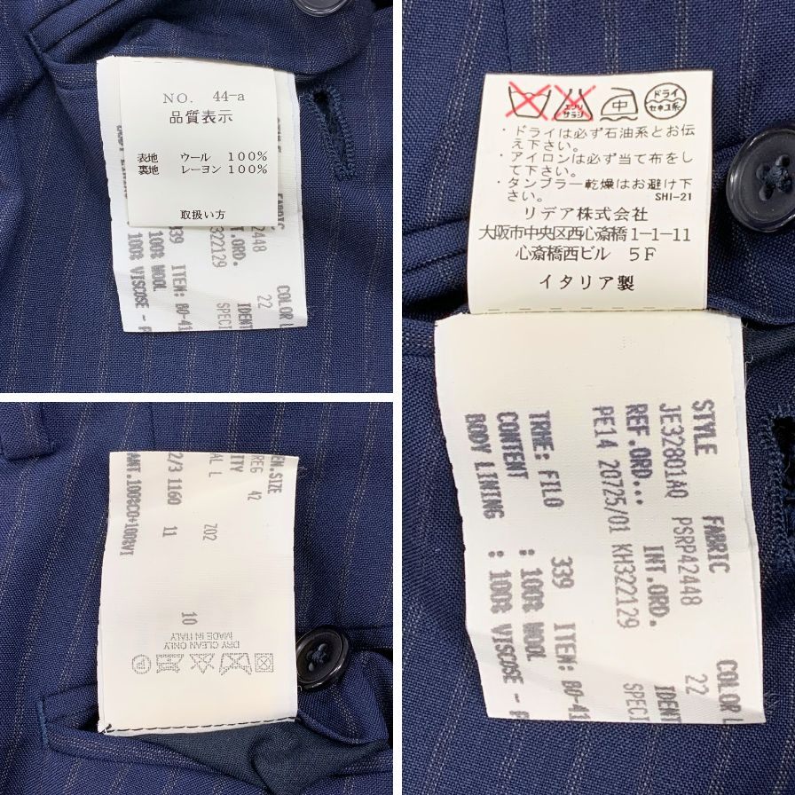 ■ジャケット 表記サイズ上【42REG】(Lサイズ相当) 着丈:70cm 肩幅:41cm 身幅:45cm 袖丈:61cm 裄丈:cm ■ボトムス 表記サイズ下【42REG】(Lサイズ相当) ウエスト:36cm 総丈:96cm 股下:72cm わたり:28cm 裾幅:18cm ※身幅は脇下2cm付近を採寸しております。 ※採寸に関しまして1~2cm程誤差が出てしまう場合もございます。予めご了承くださいませ。 |