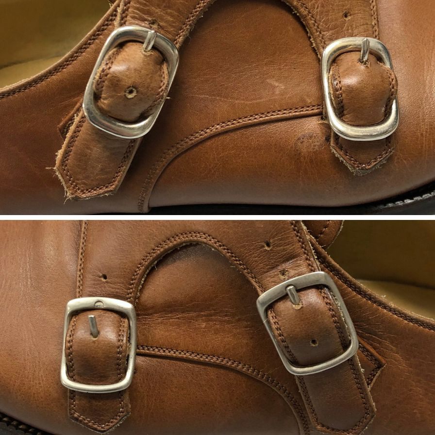 状態詳細 | 傷や履きジワ、腰裏・踵スレ、つま先にシミが見られます。 また左右バックルが違います。 |