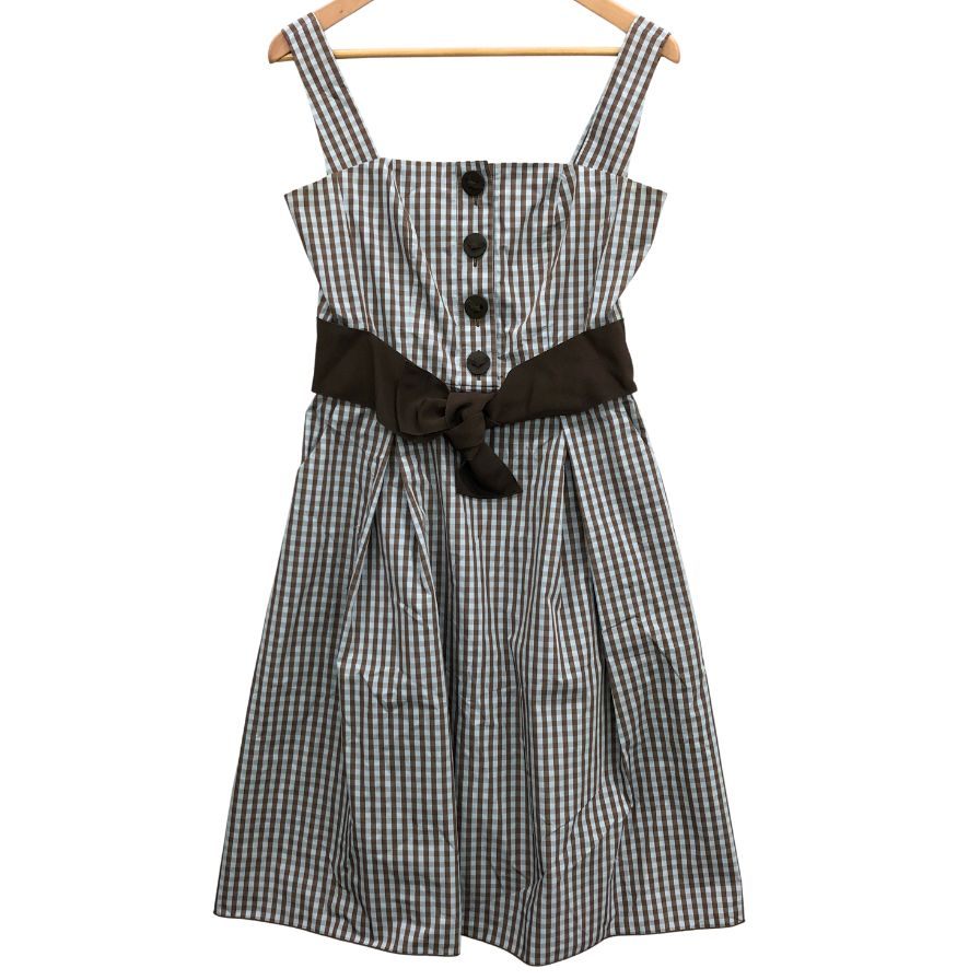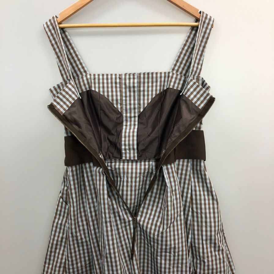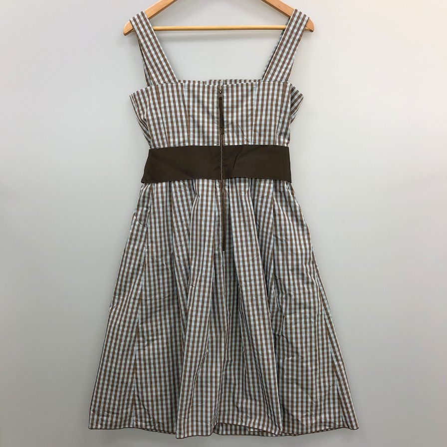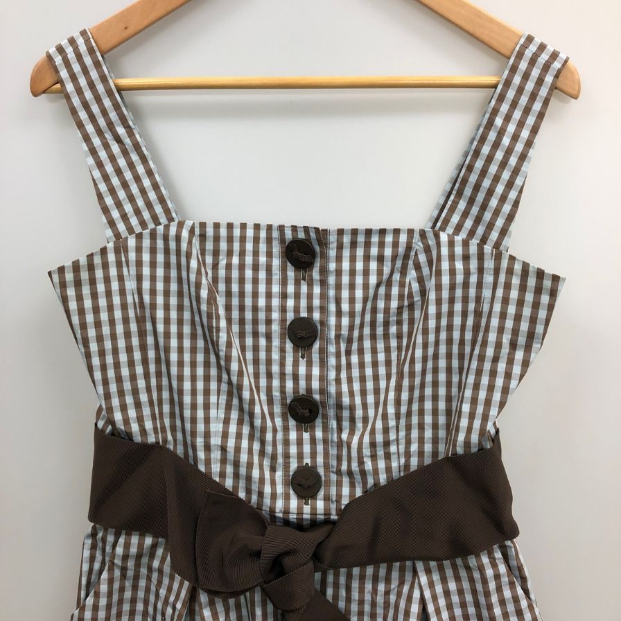 美品◆フォクシー ニューヨーク フレア 膝丈ワンピース 40サイズ ギンガムチェック リボン スクエアネック ノースリーブ FOXEY NEWYORK 【AFB8】