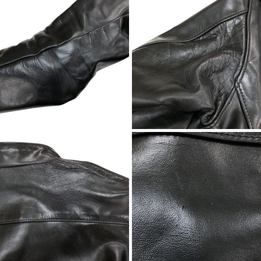 レザー表面スレ・シワ・剥がれ、裏地多少スレ、袖糸ホツレ、ジップ部分錆・くすみが見られます。 |