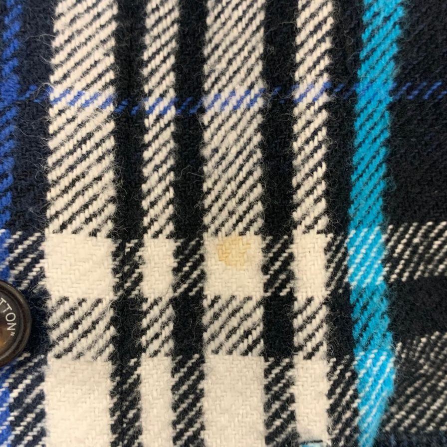 袖口に弱スレ、前面にシミが見られます。 |