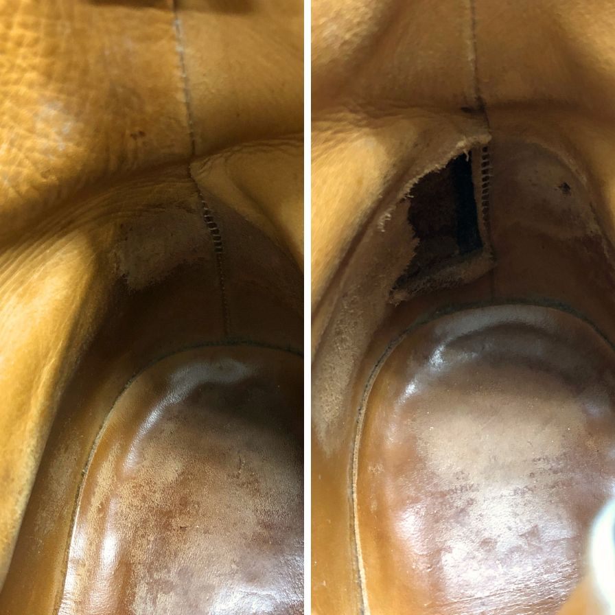 状態詳細 | 全体汚れ、履きジワ、ヒール減り、腰裏ダメージ、インソール剥がれが見られます。 |
