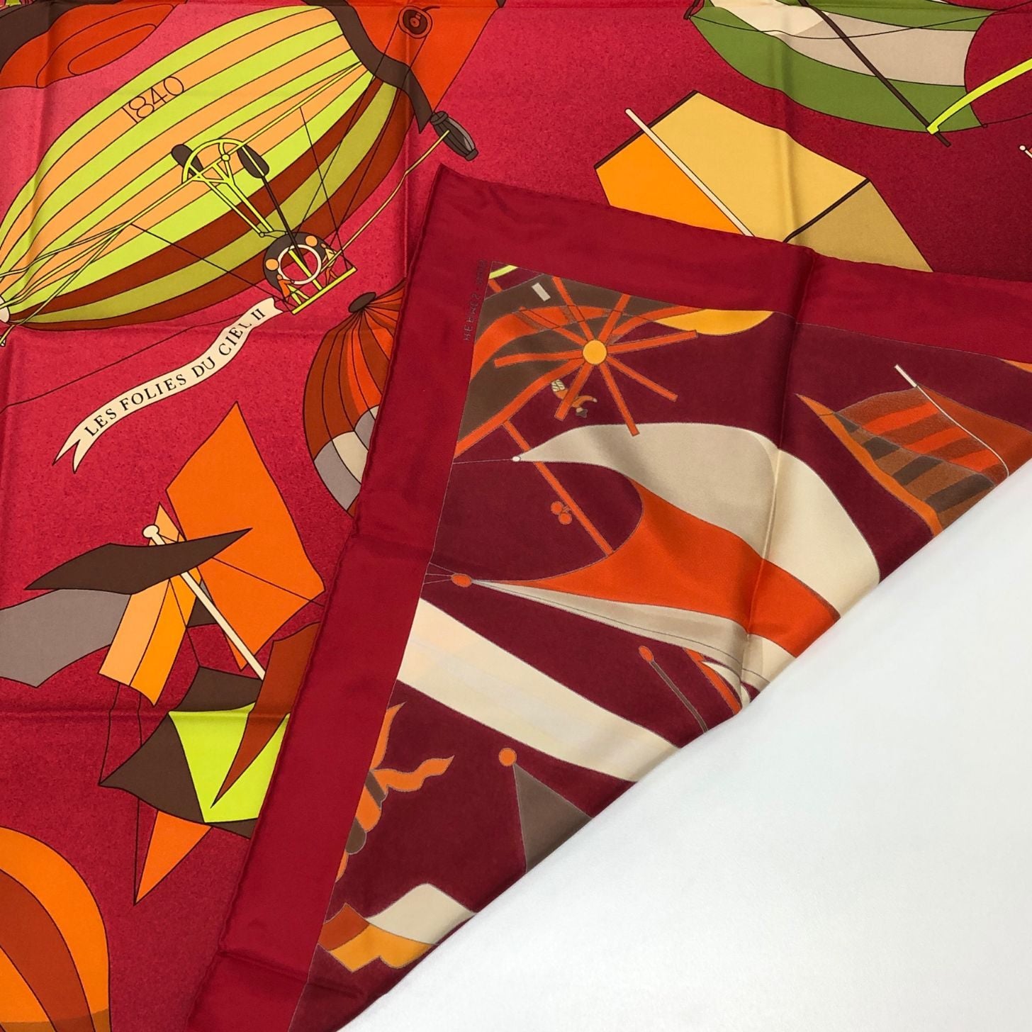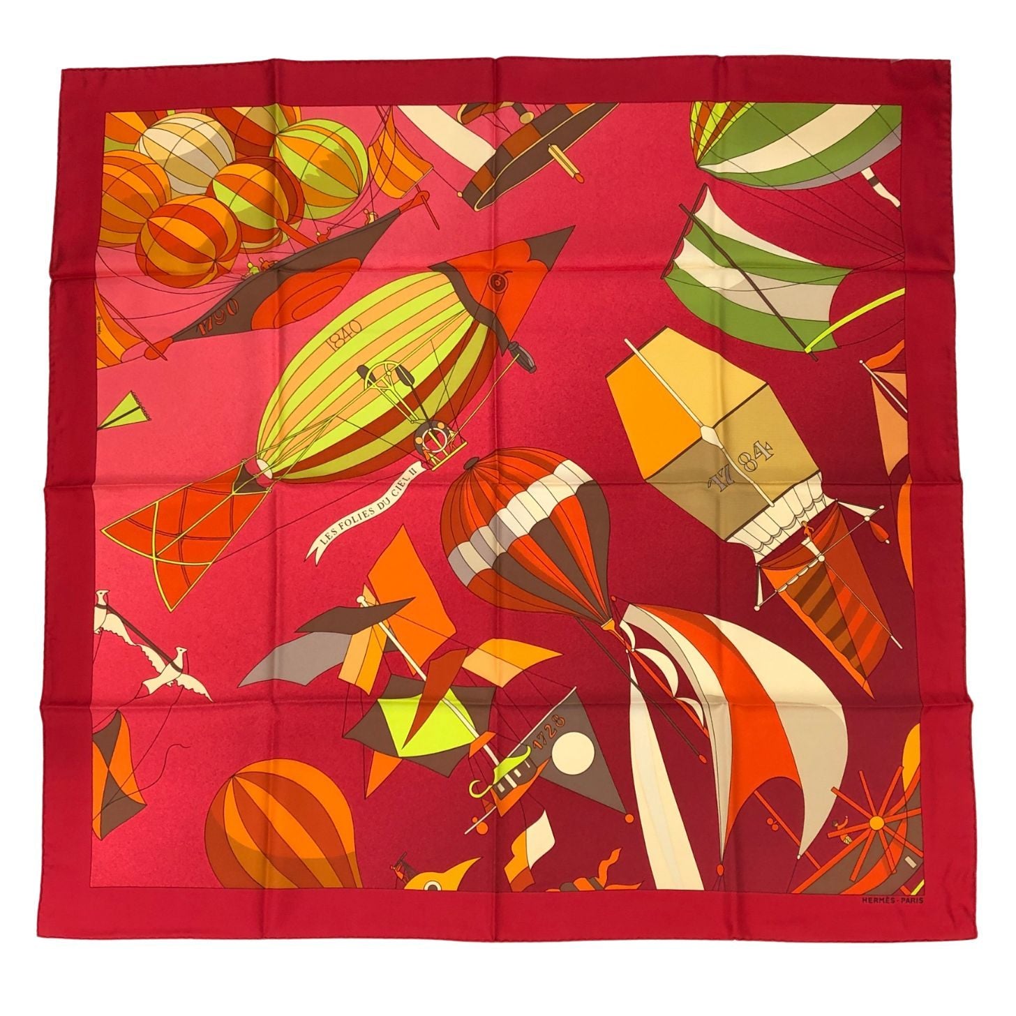 エルメス カレ90 LES FOLIES DU CIEL 大空の狂気 レッド シルク レディース HERMES【AFB53】