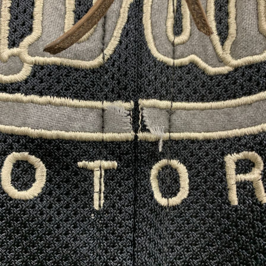 テープ部分剥がれ強、フロント部分刺繍ほつれ、金具のくすみなどが見られます。 |