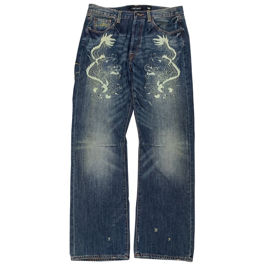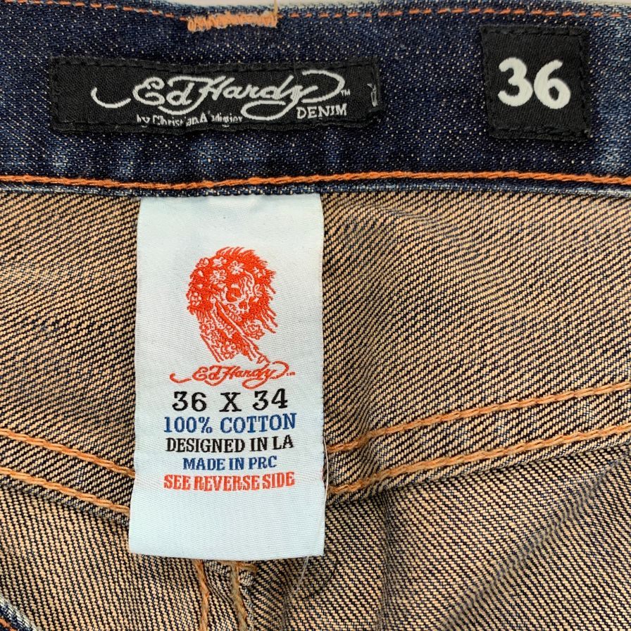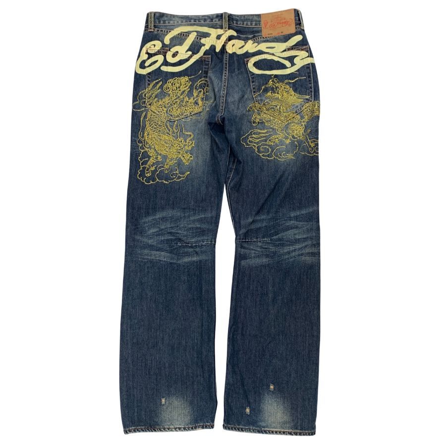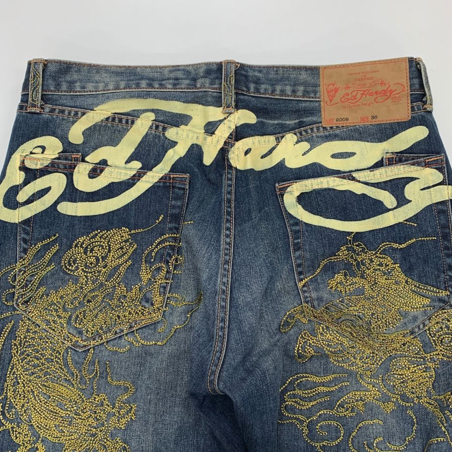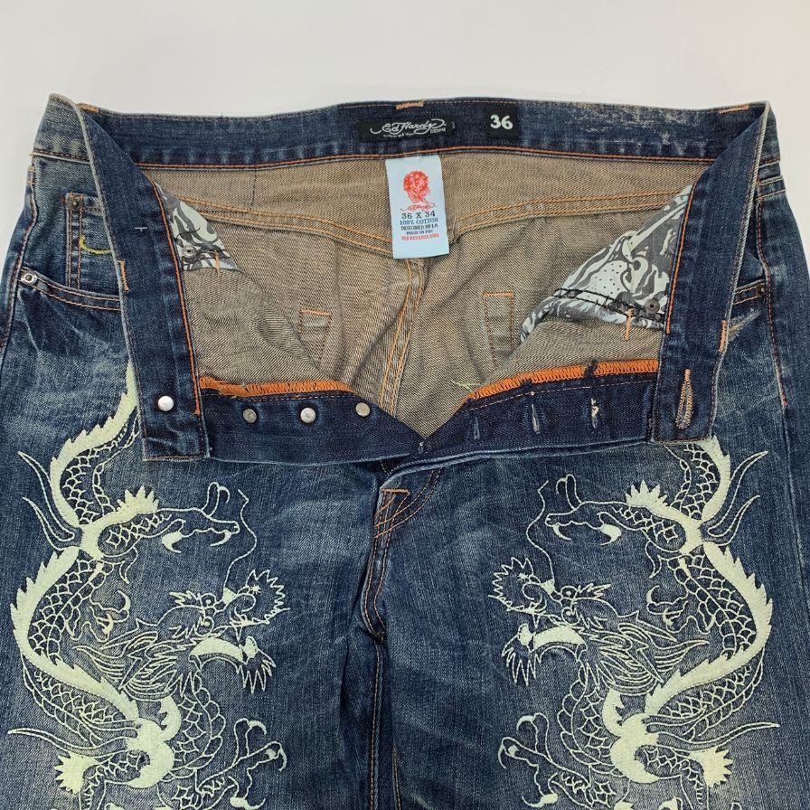 エドハーディー デニムパンツ 龍 刺繍 ペイント 装飾 ボタンフライ ウォッシュ USED加工 2009 インディゴ メンズ サイズ36 Ed Hardy 【AFB32】