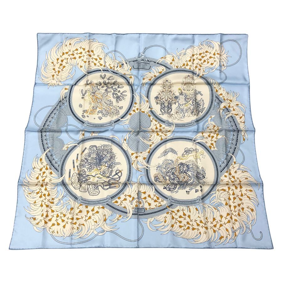 エルメス カレ90 Legende Brodee 刺繍が織りなす伝説 シルク ライトブルー HERMES【AFI18】