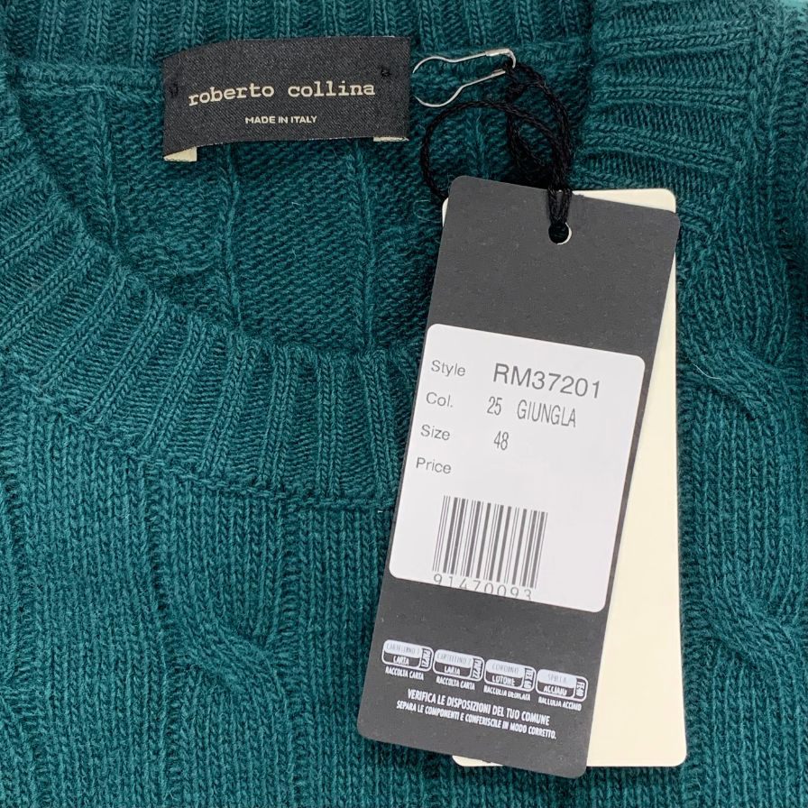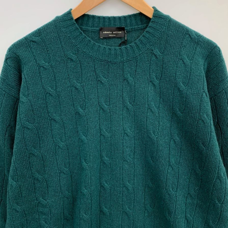 新品同様◆ロベルトコリーナ ニットセーター ケーブル編み ミドルゲージ ウール クルーネック グリーン メンズ48 roberto collina 【AFB5】
