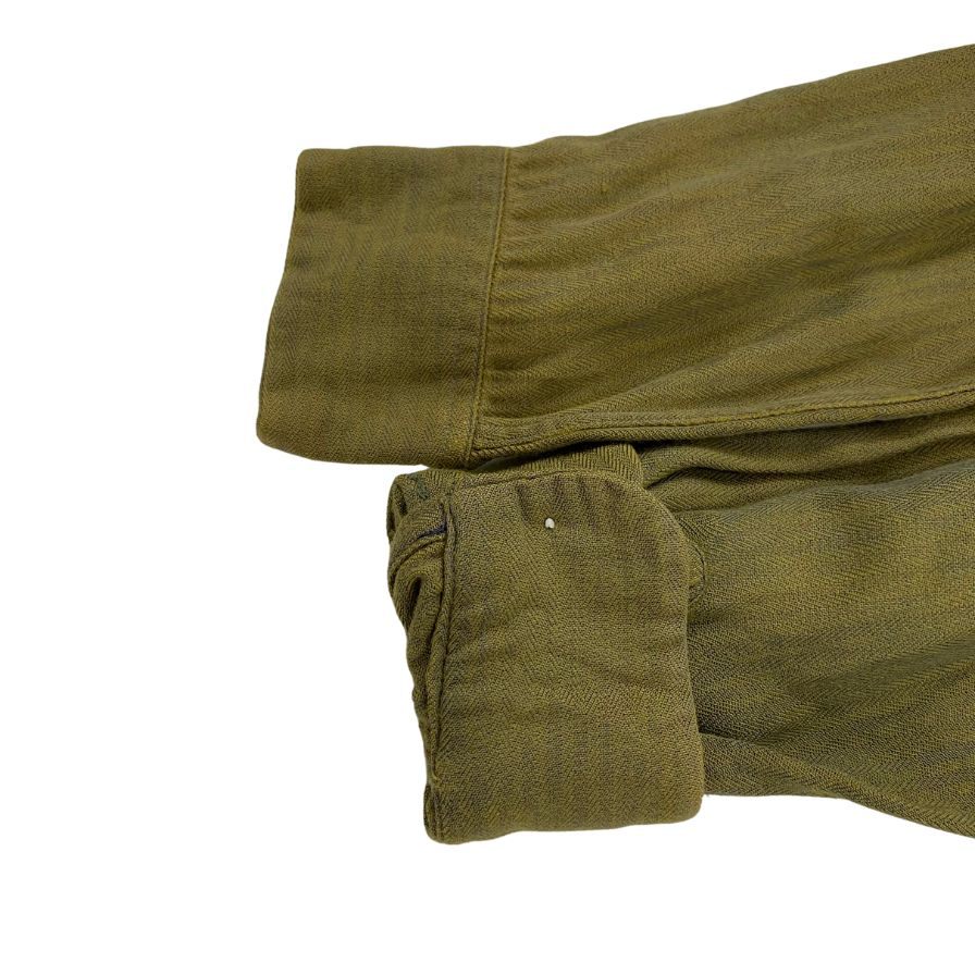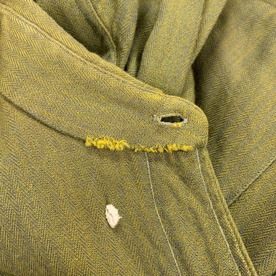 首後ろ部分・両袖カフスボタンホールダメージ、胸ポケット小傷、第3ボタン周り・裾裏汚れが見られます。 |