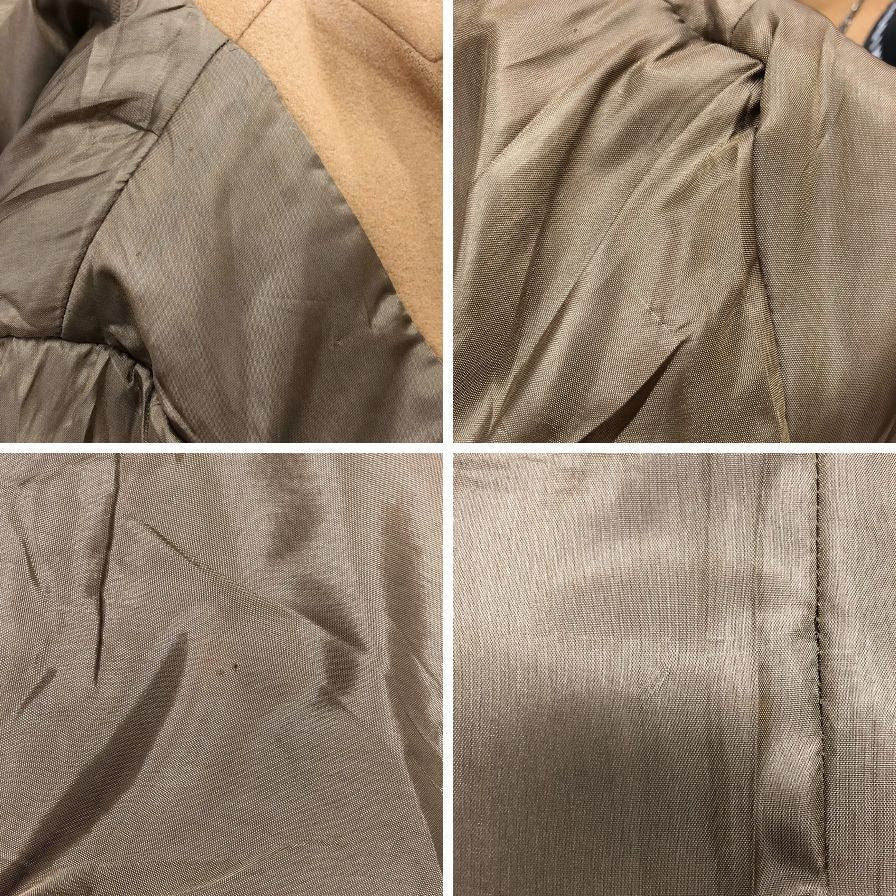 全体シワ、首回り・袖口スレ・薄汚れ、裏地スレ・穴、品質タグ欠損が見られます。(画像参照) |
