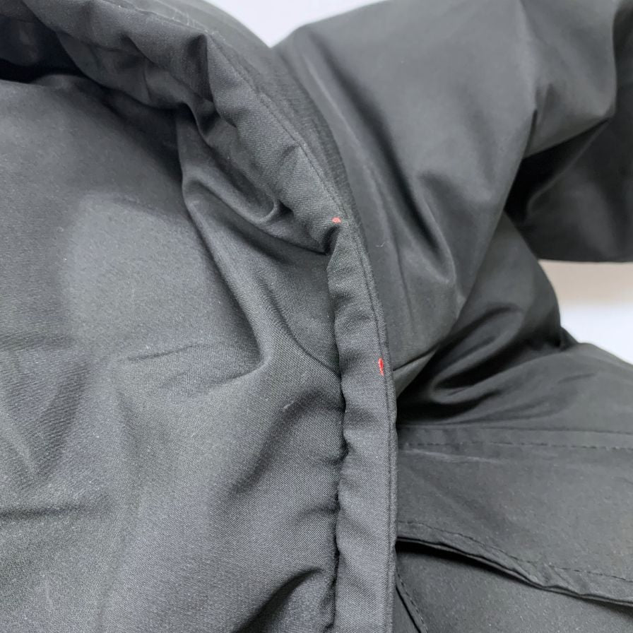消臭剤匂いあり、袖リブ使用感と毛玉、袖に傷、フードに赤い汚れが見られます。 |