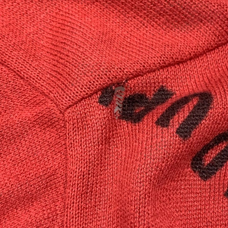 表面に毛羽立ち、肩部分に穴、前身頃にシミが見られます。 |