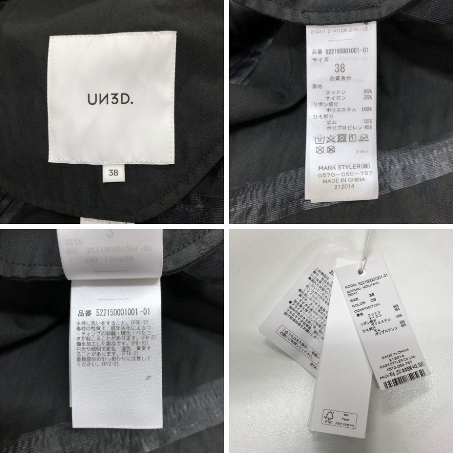 美品◆アンスリード コート ミニマル マウンテン フード ジャケット コットン ナイロン ブラック レディース サイズ38 UN3D 【AFA15】