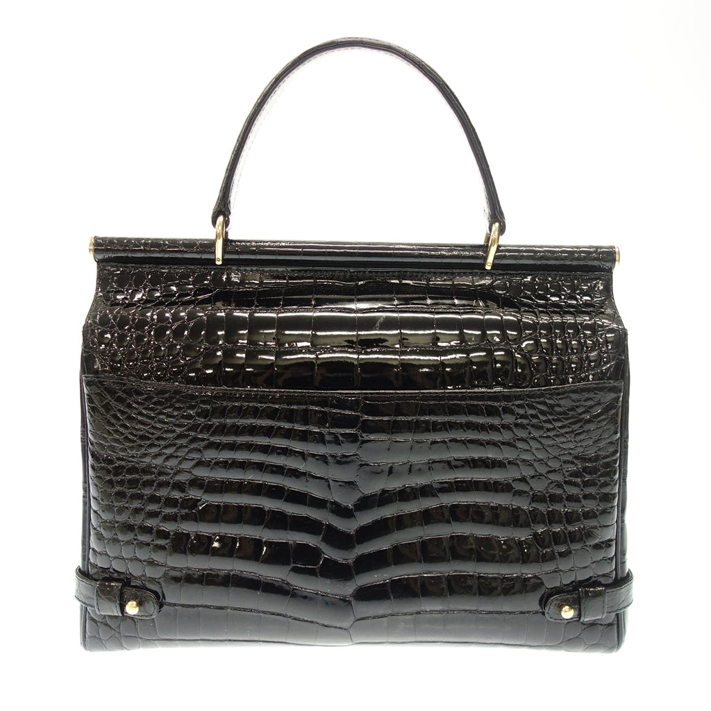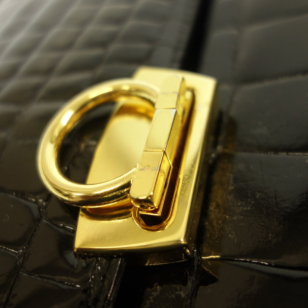 極美品◆ノーブランド シャイニークロコダイル ハンドバッグ ブラック ゴールド金具【AFE12】