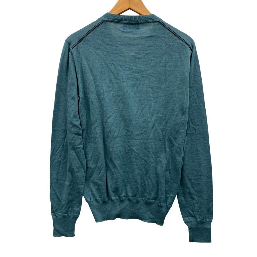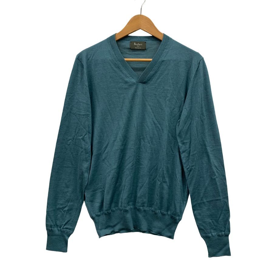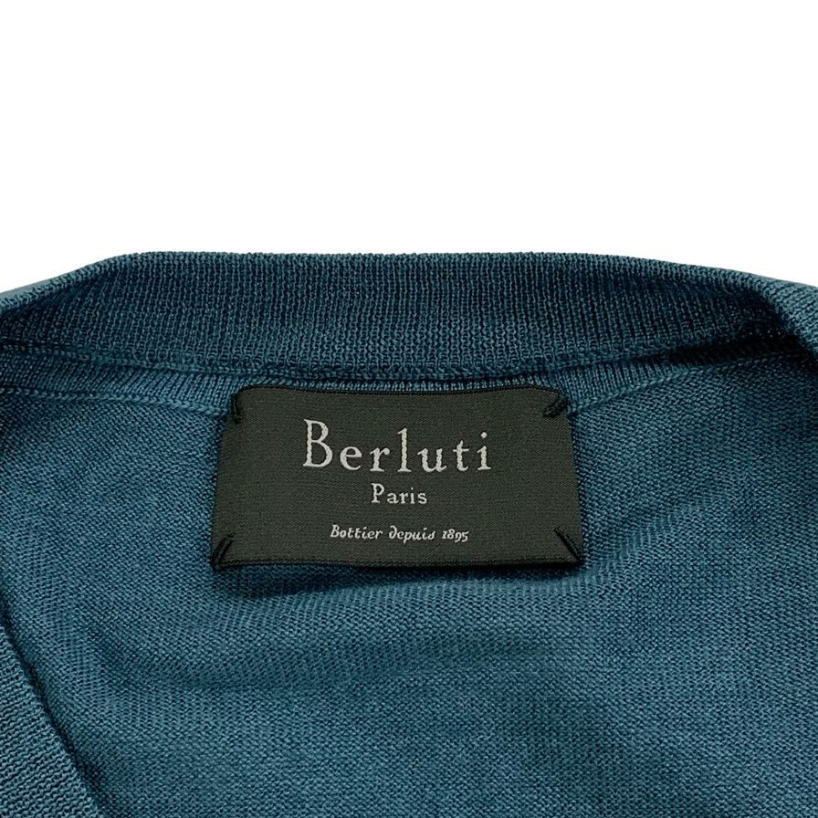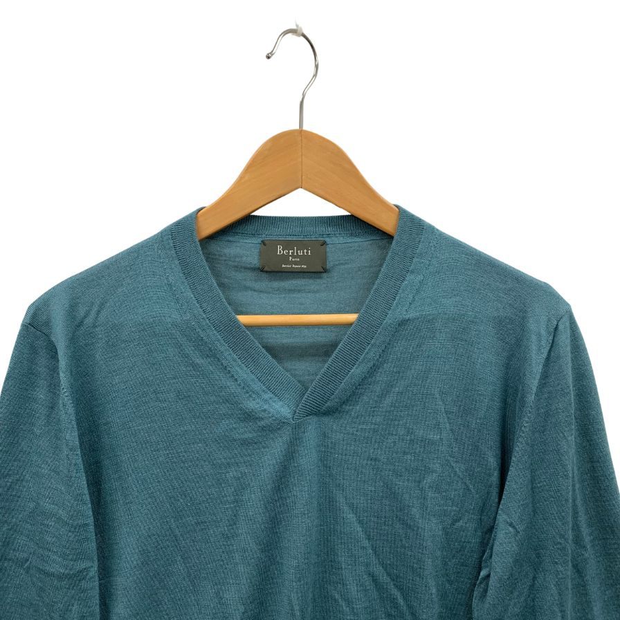 美品◆ベルルッティ ニットセーター Vネック 長袖 レザーパイピング シルク カシミヤ混 メンズ サイズ50 ブルー系 Berluti 【AFB12】
